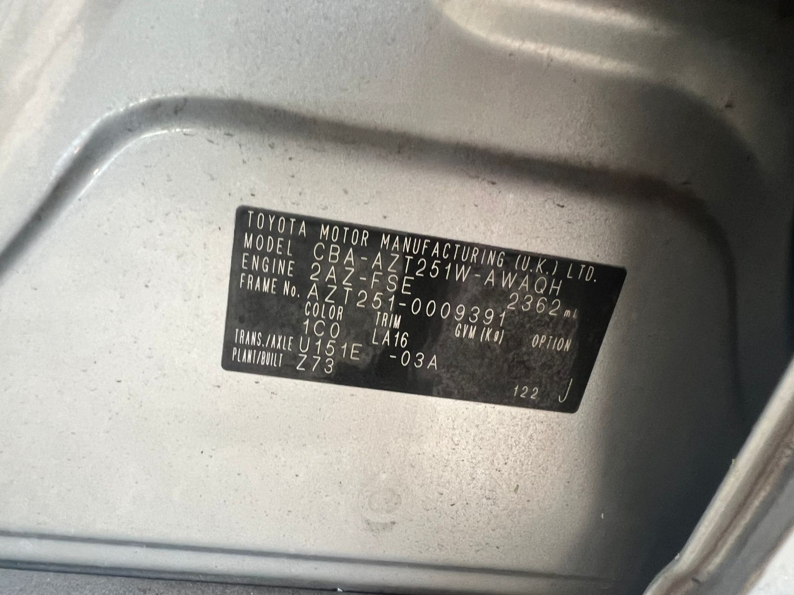 Данные автомобиля: Toyota Avensis AZT251W 2AZ-FSE 2008