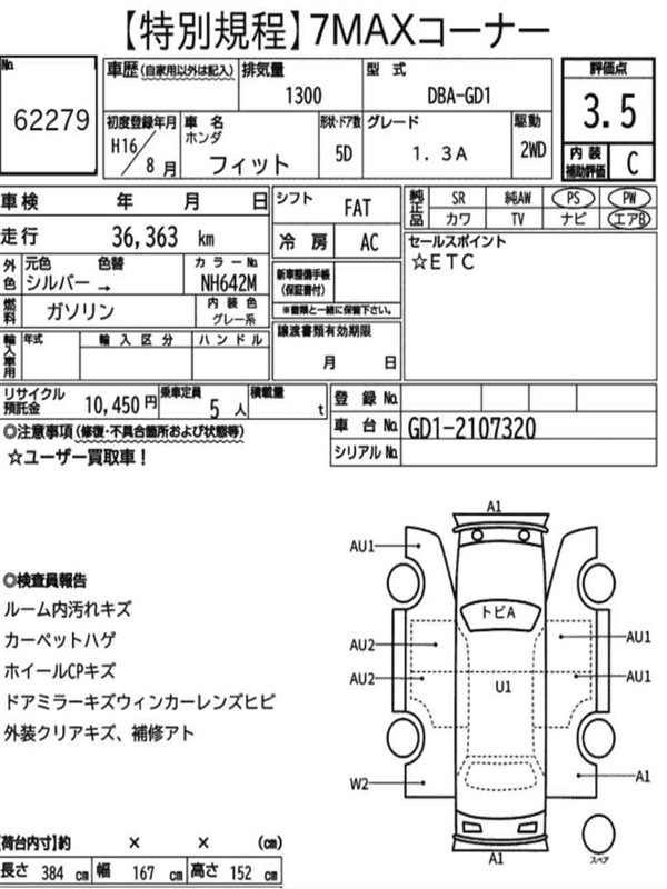 Данные автомобиля: Honda Fit GD1 L13A 2007