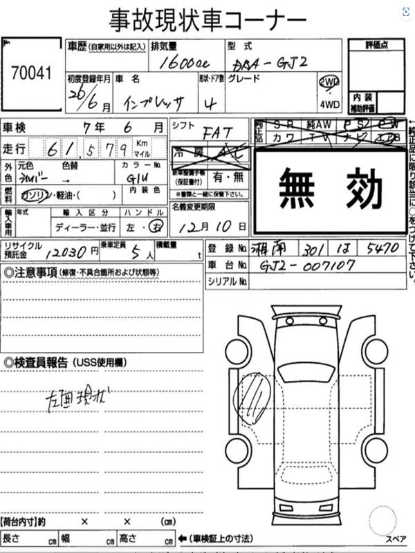 Данные автомобиля: Subaru Impreza GP7 FB20A 2012