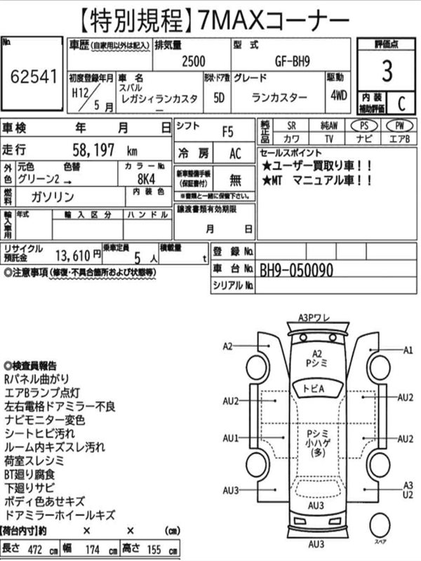 Данные автомобиля: Subaru Legacy Lancaster BH9 EJ254 2000