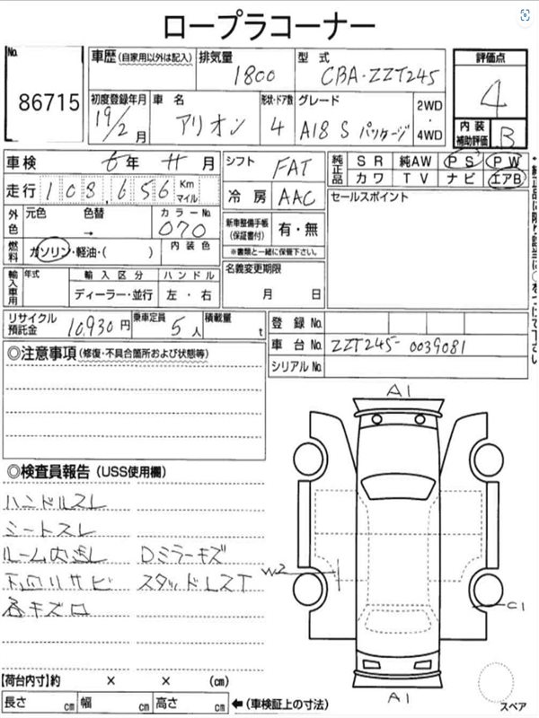 Данные автомобиля: Toyota Allion ZZT245 1ZZ 2007